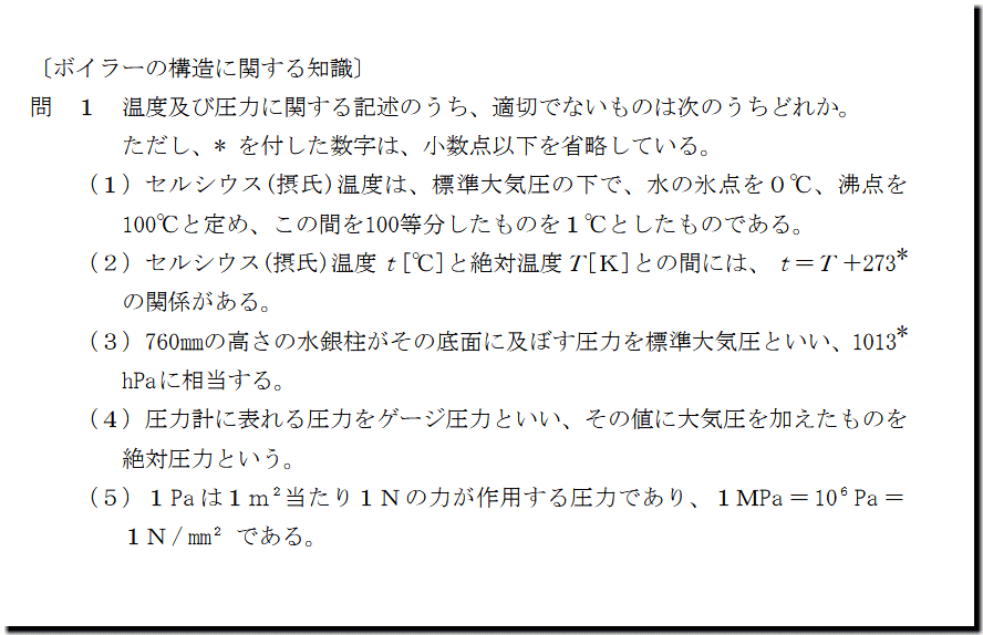 二級ボイラー技士 過去問+解説:令和7年10月の第1問は、「温度及び圧力」の論点です。文系には難儀な知識問題です。最終解答は、理系の一般常識的なものですが、きついですね。過去問に出たことは、甘く見てはいけないので、解けるようにはなっておきましょう。
