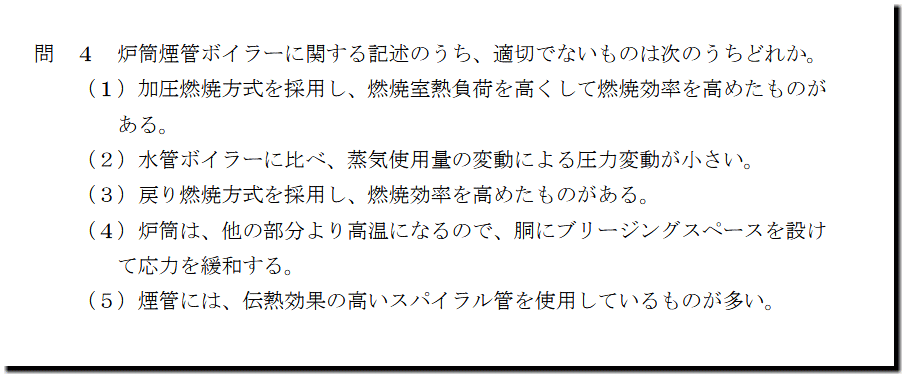 選択肢4の「炉筒は、他の部分より高温になるので、胴にブリージングスペースを設けて応力を緩和する。」ですが、誤った記述です。