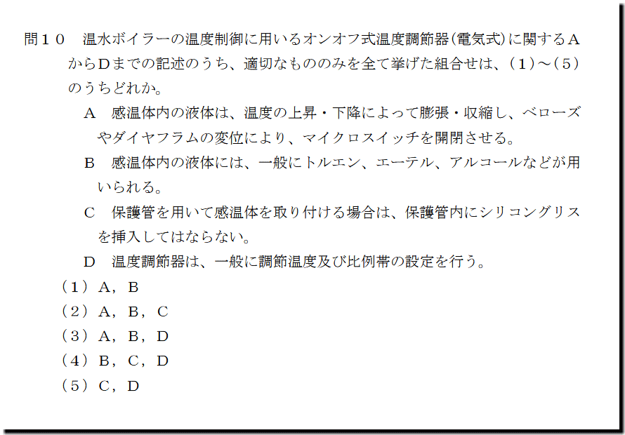 二級ボイラー技士 過去問+解説:令和7年10月の第10問は、「オンオフ式温度調節器」の問題です。過去に一応出題実績がありますが、まあ「捨て問」なので、解けないでしょう。落として仕方がないですが、復習だけはしておきましょう。