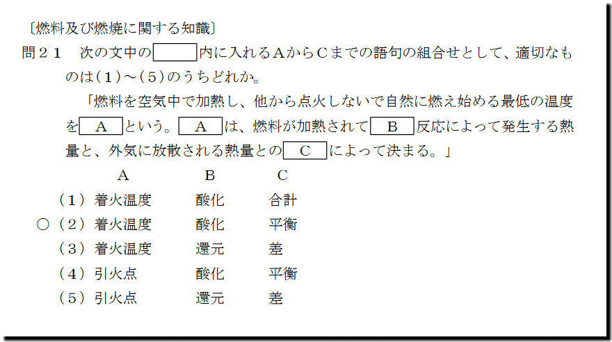 二級ボイラー技士 過去問+解説:令和7年10月の第21問目の解説。本問は、「燃焼基本用語」の問題です。選択肢のうち2つは、基本問題ですが、残り1つが新手です。わからなければ、後は運否天賦で答えましょう。