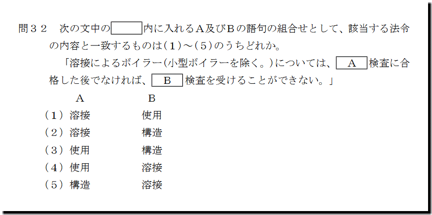 二級ボイラー技士 過去問+解説:令和7年10月の第32問目の解説。本問は、「法定検査」を問う問題です。定番の論点と、これまでにあまり問われなかった検査が問われています。復習だけはしておきましょう。