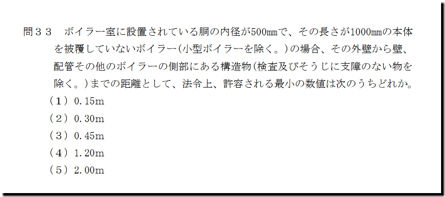 なお、問題文の言うような「胴の内径が500mmで、その長さが1000mmの本体 を被覆していないボイラー」で“ないとき”は、「0.45m以上」となります。