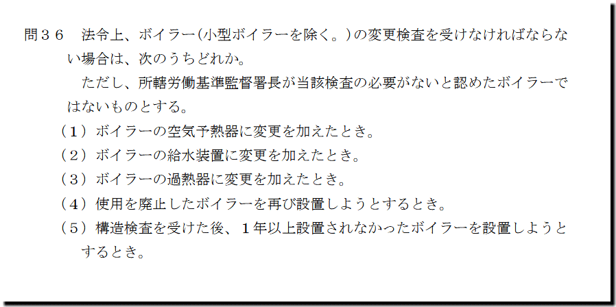 二級ボイラー技士 過去問+解説:令和7年10月の第36問目の解説。本問は、「変更検査」の問題です。繰り返し問われる論点です。基本は、知識問題です。
