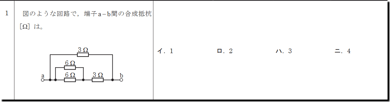 第1問は、電気理論でおなじみ「合成抵抗」の計算問題です。文系は、解き方を押えておきましょう。