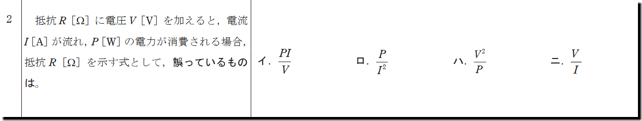 第2問は、電気理論でおなじみ「公式問題」を問う問題です。オームの法則「V=IR」と、消費電力の「P=VI」といった基本の公式で取れます。