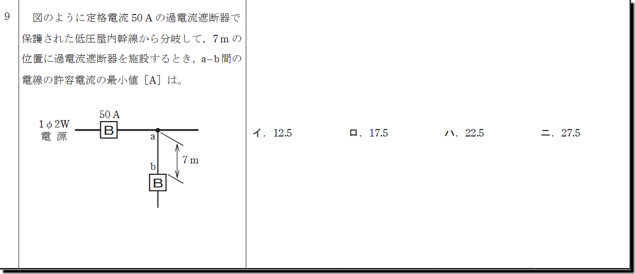 本問のケースでは、遮断器を幹線から「7m」のところに施設しているので、「例外2」の「分岐回路の過電流遮断器の施設位置」が「3メートルを越え8メートル以下」のときは、「0.35×過電流遮断器の定格電流」に該当します。