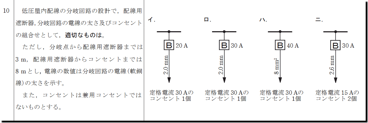 第10問は、配線設計でおなじみの論点「分岐回路」の問題です。当該論点も、よく試験に出ます。字面だけ追うと面倒ですが、問題自体はカンタンな部類です。憶えることも少ないので、何回も類問を解いて、100%取れるようになっておきましょう。文系ド素人なら率先して取ります。