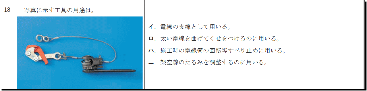 よって、「ニ.架空線のたるみを調整するのに用いる」が答えとなります。
