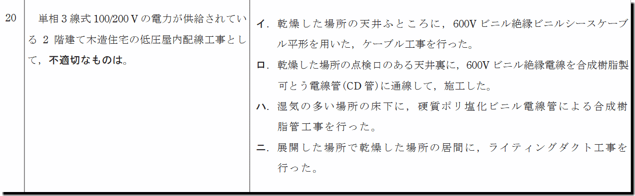 「ロ」の「乾燥した場所の点検口のある天井裏に,600V ビニル絶縁電線を合成樹脂製 可とう電線管(CD 管)に通線して,施工した。」ですが、誤った記述です。