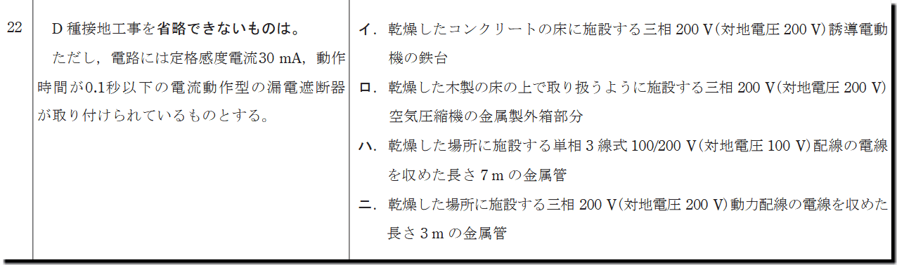 たとえば、「動作時間“0.5秒”の漏電遮断器を付けたので、接地工事を省略した」などと問われています。
