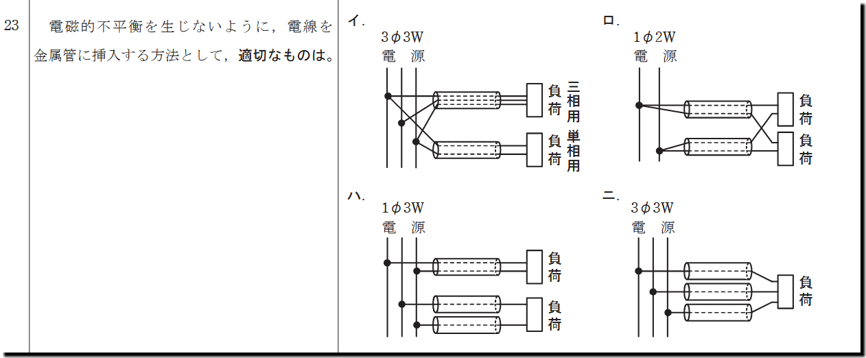 第23問は、学科の定番論点の「電磁的不平衡」の問題です。一見するとアレですが、ほぼ同じ問題が出るので、問いと答えとを暗記しましょう。