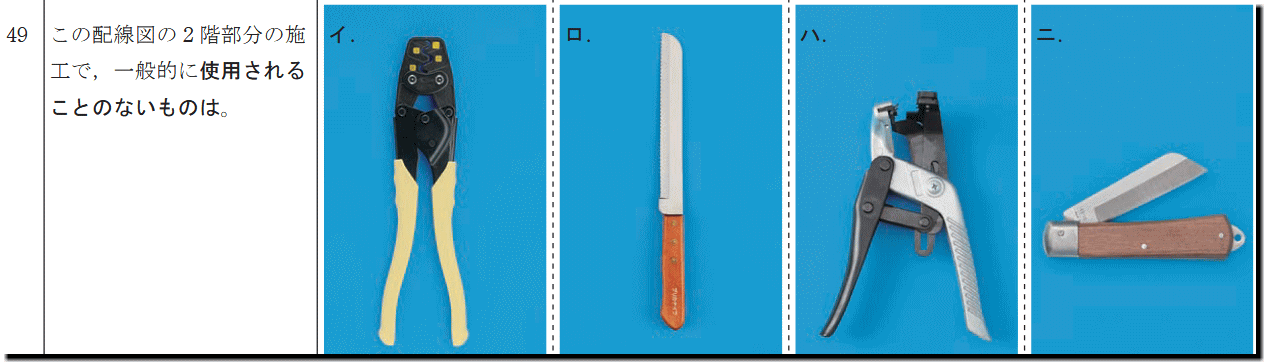 令和5年度(2023年度)第2種電気工事士の下期午後学科:第49問は、「未使用工具当て」の問題です。基礎・基本的なものばかりなので、難しいところはありません。テキストと過去問を繰り返しておけば、まず、取れます。