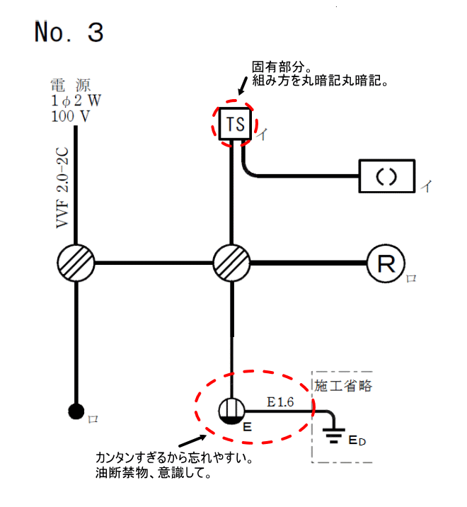 第2種電気工事士の技能試験の候補問題:No.3を解説するページ。No.3は、固有部分の「TS(タイムスイッチ)」のところが、やや「難」だが、全体的にやさしいラッキー問題である。本問の練習の仕方や、攻略、要領、手順を説述する。独学者向け。技能試験が本問だったら、確実に合格したい。