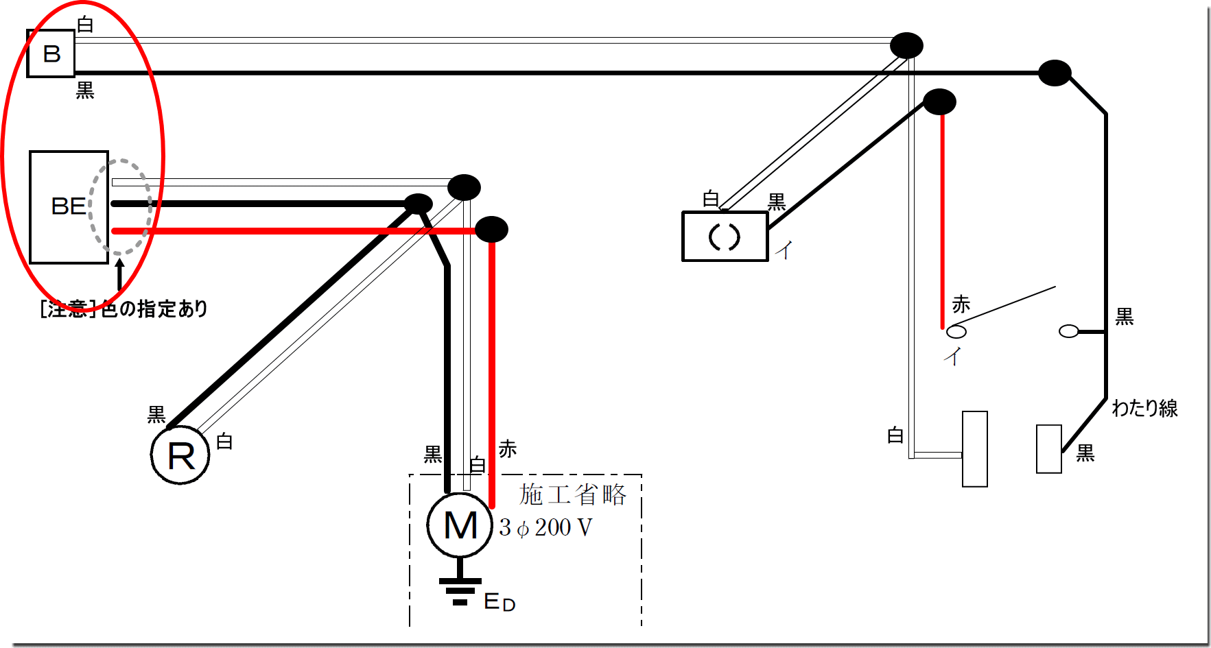 問題文で指定された色で、複線図を書いてください。