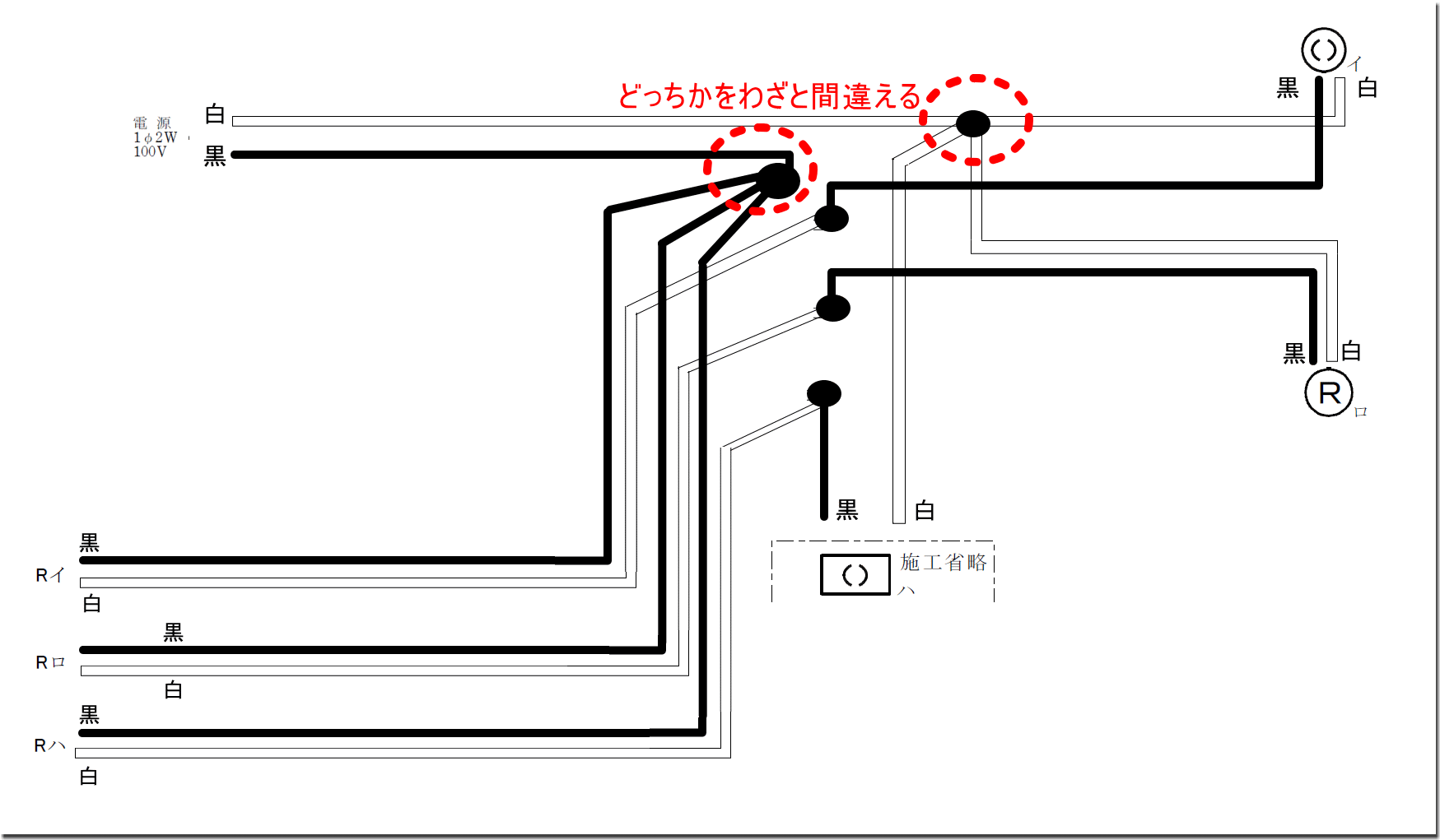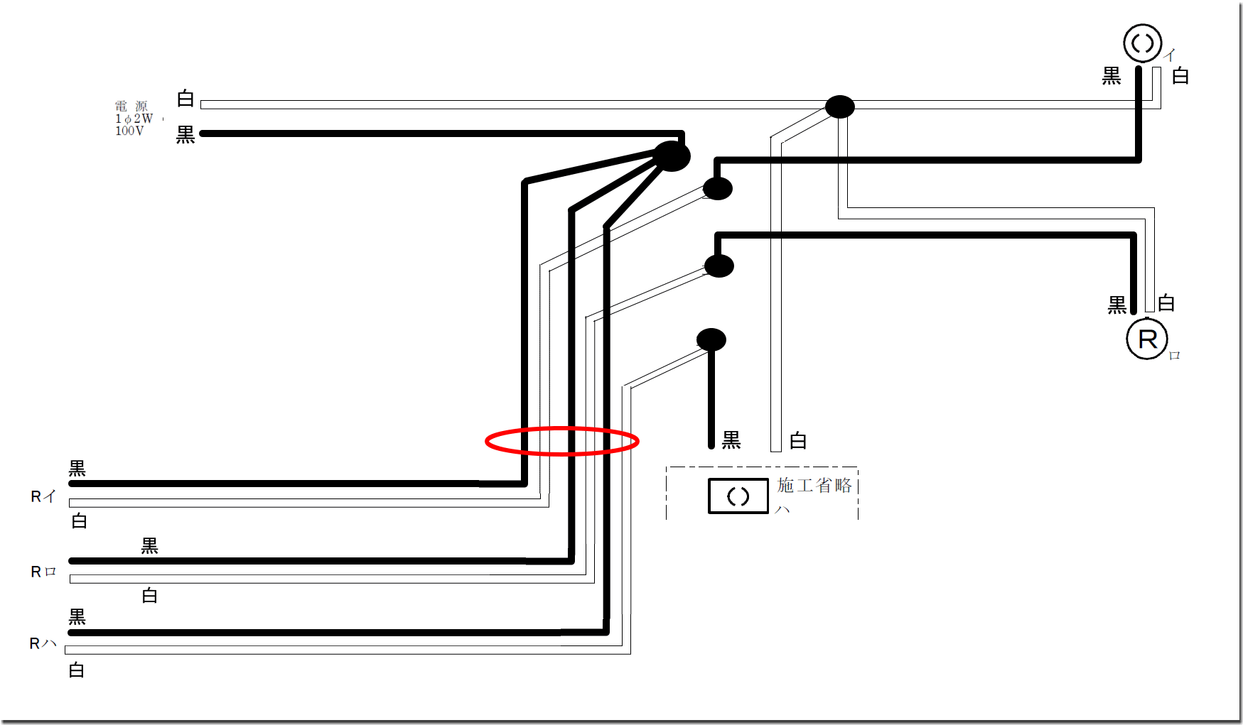つまり、リレー部分(Rイ・Rロ・Rハ)の黒線は「非接地側電線」に、白線は「電気(負荷)」に繋げたらいい、ってな寸法です。