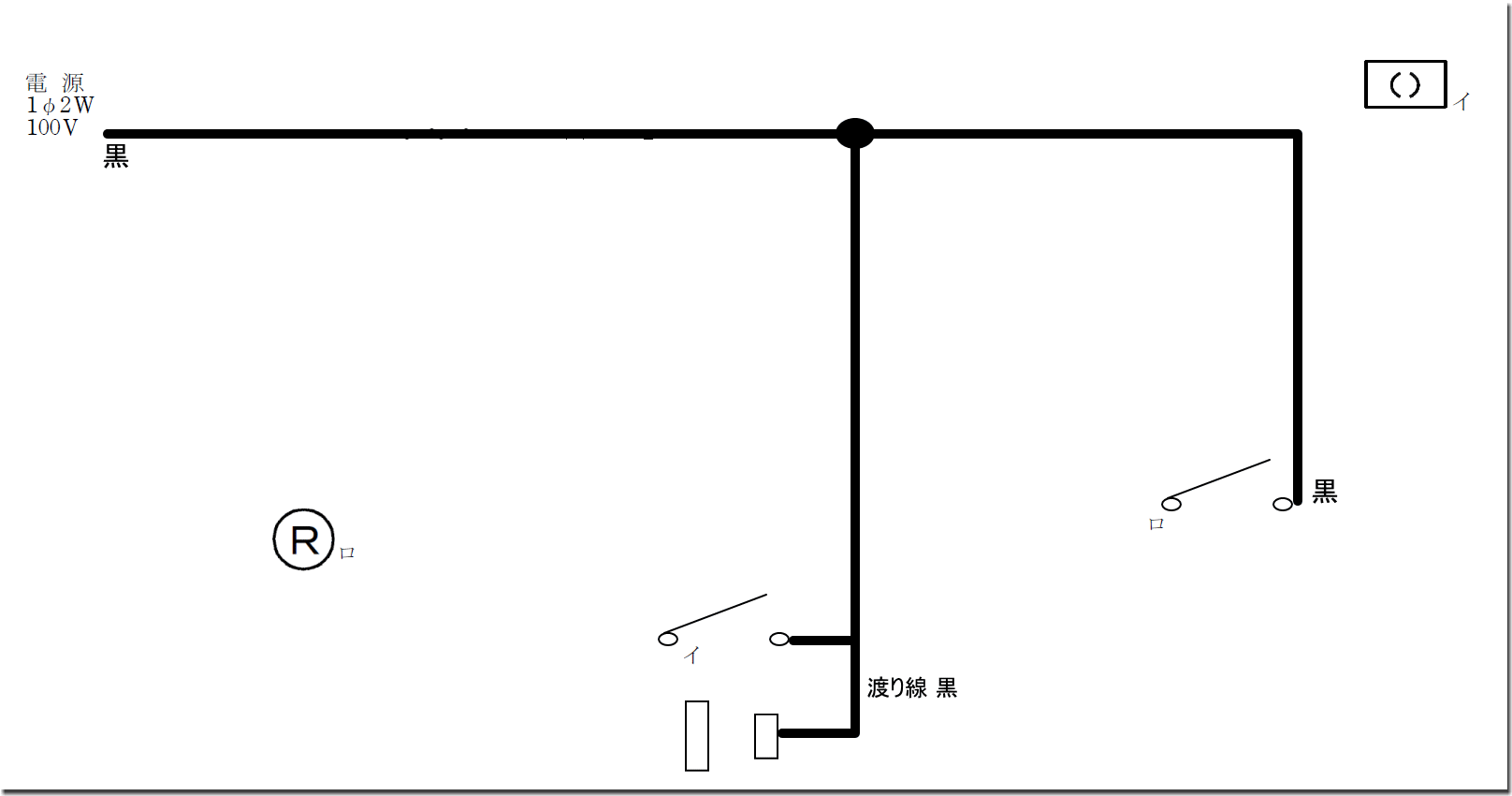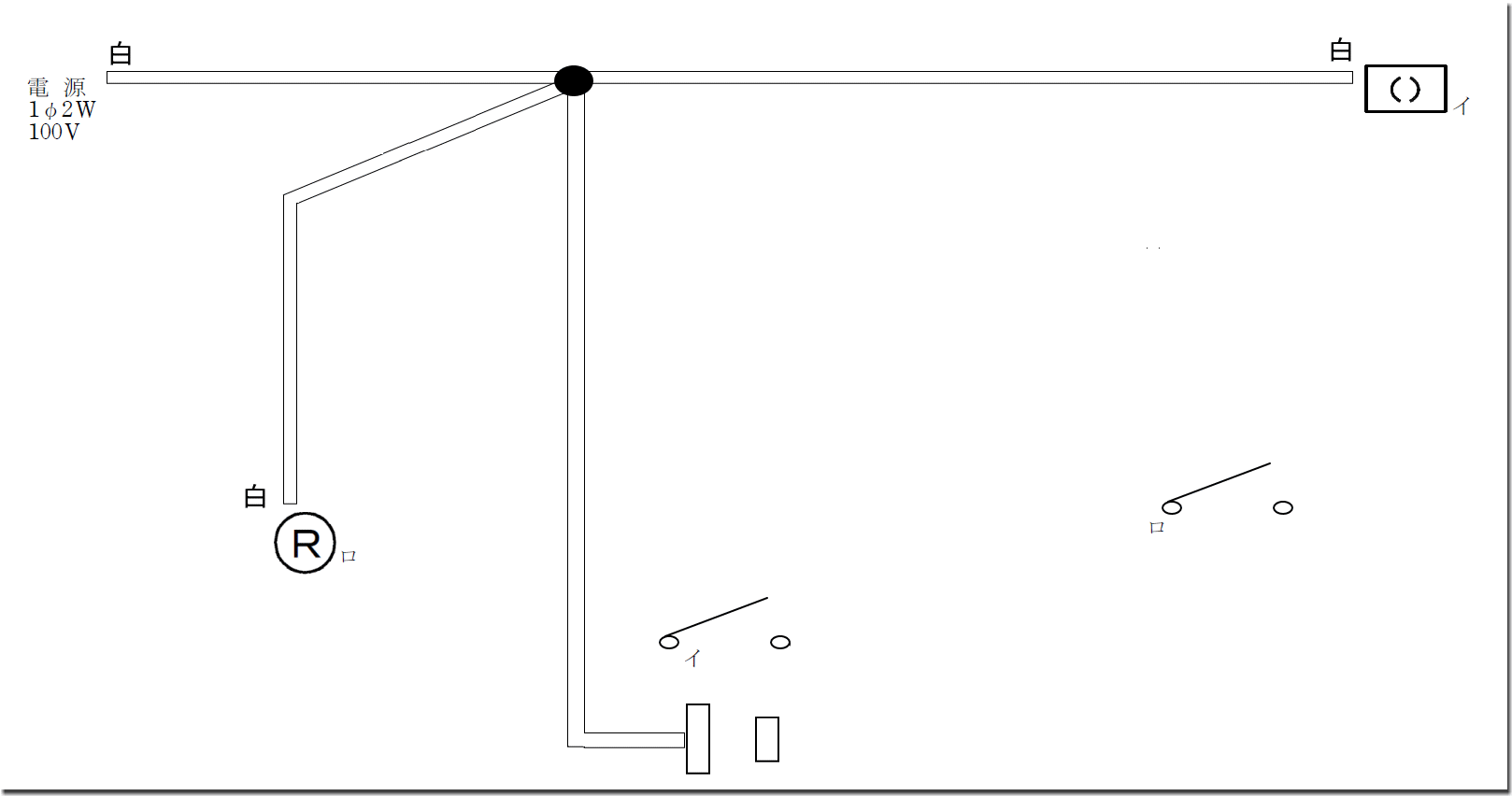 いつものように、「イ」の「引掛けシーリング」と、「ロ」の「ランプレセプタクル」と、「コンセント」を、接地側の白線とつなぎましょう。