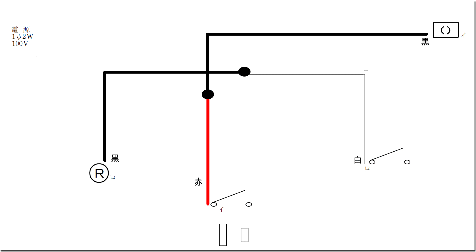 「イ」の引掛けシーリングとスイッチですが、おおむね「赤」でつなげると思います。