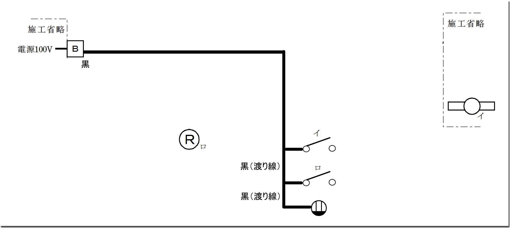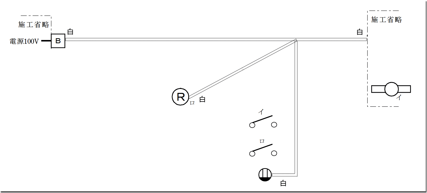 本問では、接地側の電源線に、「イ」の施工省略の電灯と、「ロ」のランプレセプタクルと、コンセントとをつなげることと相なります。