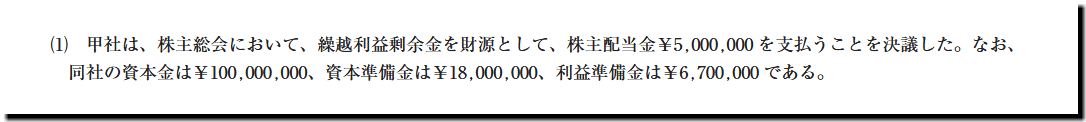 問題文には、「甲社は、株主総会において、繰越利益剰余金を財源として、株主配当金¥5,000,000 を支払うことを決議した。なお、 同社の資本金は¥100,000,000、資本準備金は¥18,000,000、利益準備金は¥6,700,000 である」とあります。