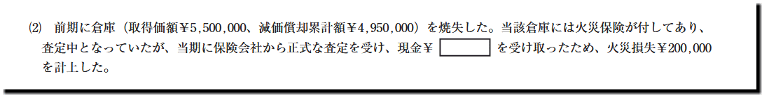 問題文には、「当期に保険会社から正式な査定を受け、現金¥???を受け取ったため、火災損失¥200,000 を計上した。」とあります。