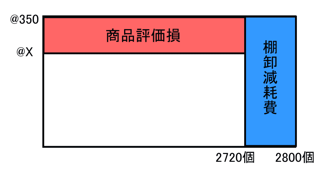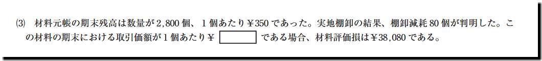 問題文には、「材料元帳の期末残高は数量が 2,800 個、 1 個あたり¥350 であった。実地棚卸の結果、棚卸減耗 80 個が判明した」とあります。