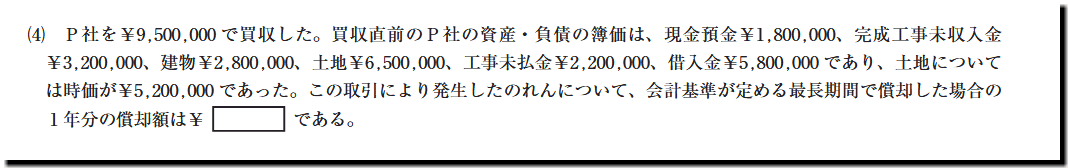 本問は『のれん代』の問題です。過去に出題実績があります。買収の処理をしてその差額を計算するだけですが、償却の年数だけは憶えてないとダメです。過去問演習必須ですね。
