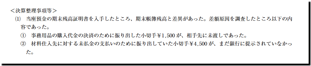 問題文には、「材料仕入先に対する未払金の支払いのために振り出していた小切手¥4,500 が、まだ銀行に提示されていなかっ た。」とあります。