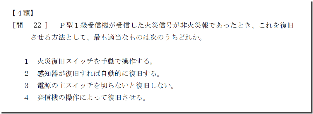 P型受信機で、非火災報が出た場合の復旧を問う問題ですが、あまり、出題実績がないので、解けない人も多いはずです。