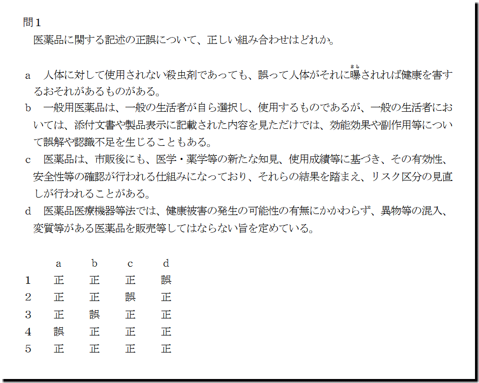 午前第1問は、「基本知識」の「医薬品」の問題です。基礎・基本的なものばかりなので、難しいところはありません。テキストと過去問を繰り返しておけば、まず、取れます。