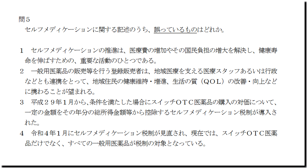 選択肢3の「平成29年1月から、条件を満たした場合にスイッチOTC医薬品の購入の対価について、 一定の金額をその年分の総所得金額等から控除するセルフメディケーション税制が導入さ れた。 」ですが、正しい記述です。