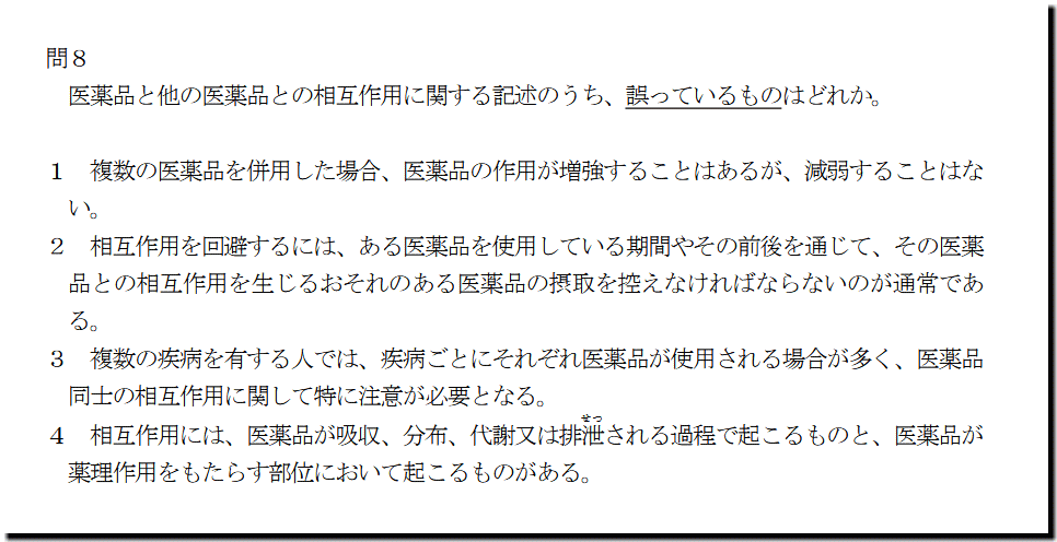 選択肢1の「複数の医薬品を併用した場合、医薬品の作用が増強することはあるが、減弱することはな い。」ですが、誤った記述です。