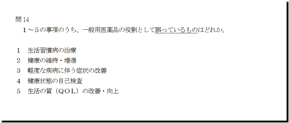 本問は、「基本知識」の「一般用医薬品の役割」についての出題です。基礎・基本的なものばかりなので、難しいところはありません。テキストと過去問を繰り返しておけば、まず、取れます。