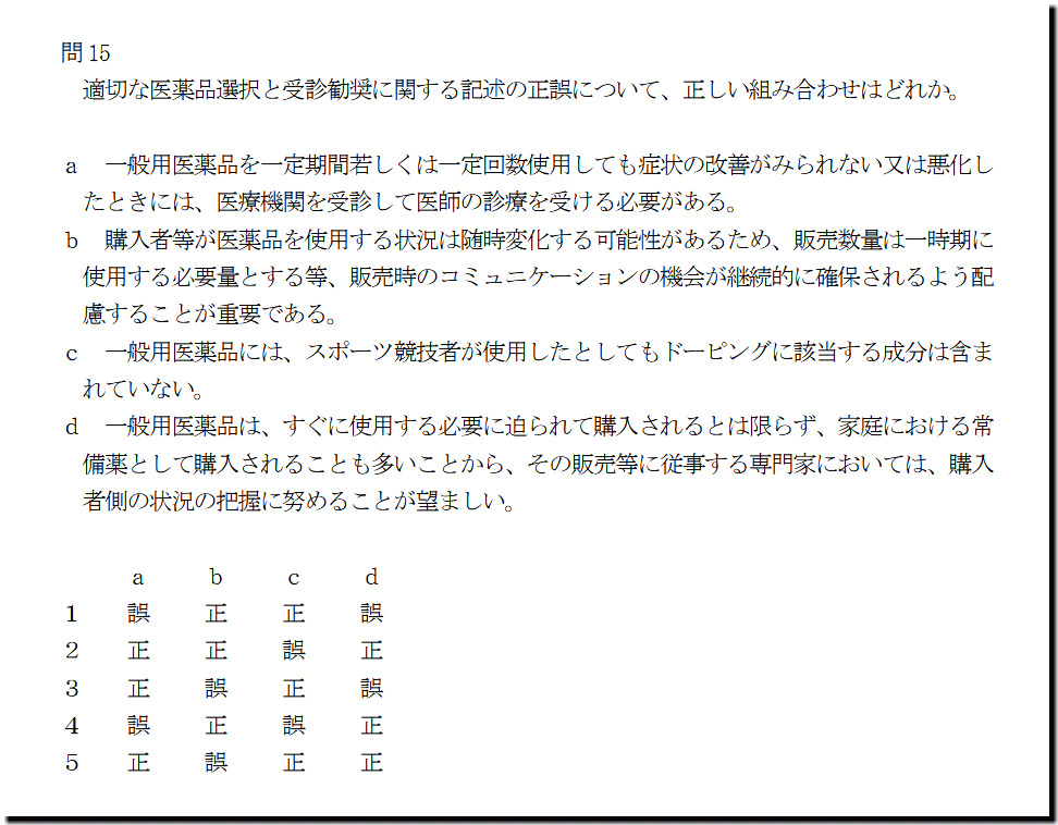 本問は、「基本知識」の「適切な医薬品選択と受診勧奨」についての出題です。基礎・基本的なものばかりなので、難しいところはありません。テキストと過去問を繰り返しておけば、まず、取れます。