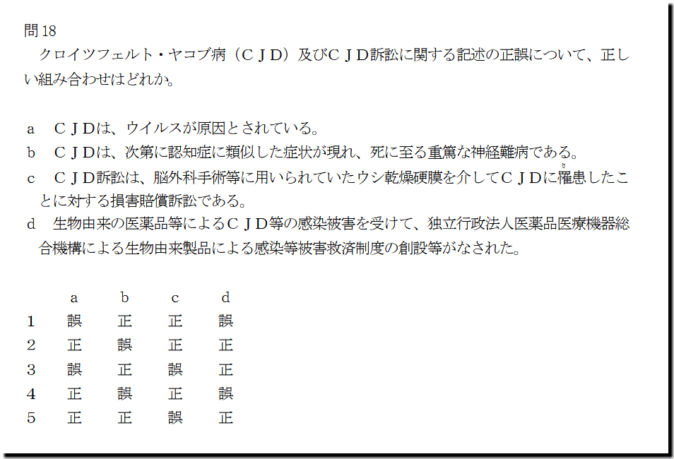 本問は、「基本知識」の「CJD訴訟」についての出題です。基礎知識では、ほぼ毎回出題される内容なので、テキストの精読は必須です。選択肢を1つとして、落とさないようにしましょう。