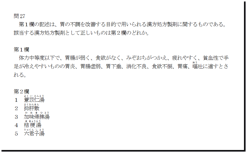本問は、「医薬品」の「漢方処方製剤(胃)」についての出題です。基礎・基本的なものばかりなので、難しいところはありません。テキストと過去問を繰り返しておけば、まず、取れます。