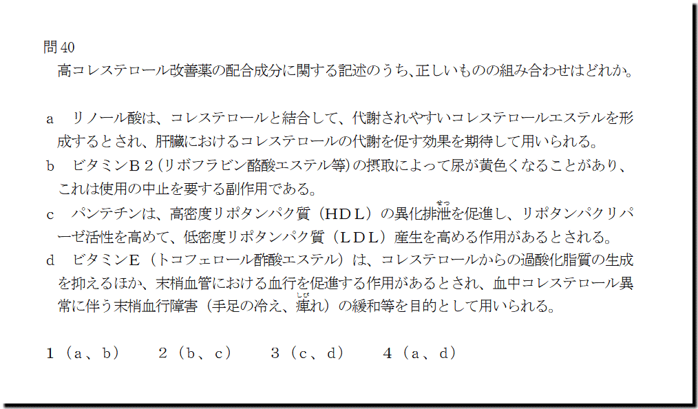 本問は、「医薬品」の「高コレステロール改善薬」についての問題です。基礎・基本的なものばかりなので、難しいところはありません。テキストと過去問を繰り返しておけば、まず、取れます。
