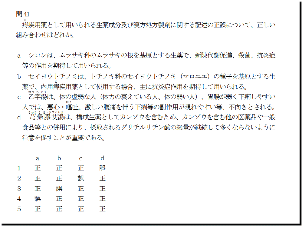 選択肢cの「乙字湯 は、体の虚弱な人(体力の衰えている人、体の弱い人)、胃腸が弱く下痢しやすい 人では、悪心・嘔 お う 吐、激しい腹痛を伴う下痢等の副作用が現れやすい等、不向きとされる。」ですが、正しい記述です。