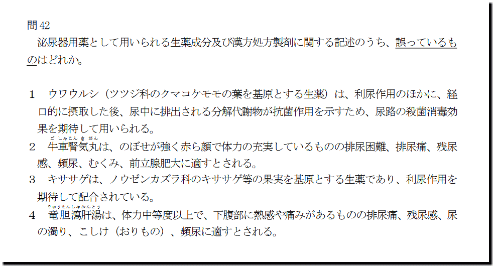 本問は、「医薬品」の「泌尿器用薬」の問題です。生薬と漢方処方製剤の混合問題です。これも、勉強してないと厳しいですね。