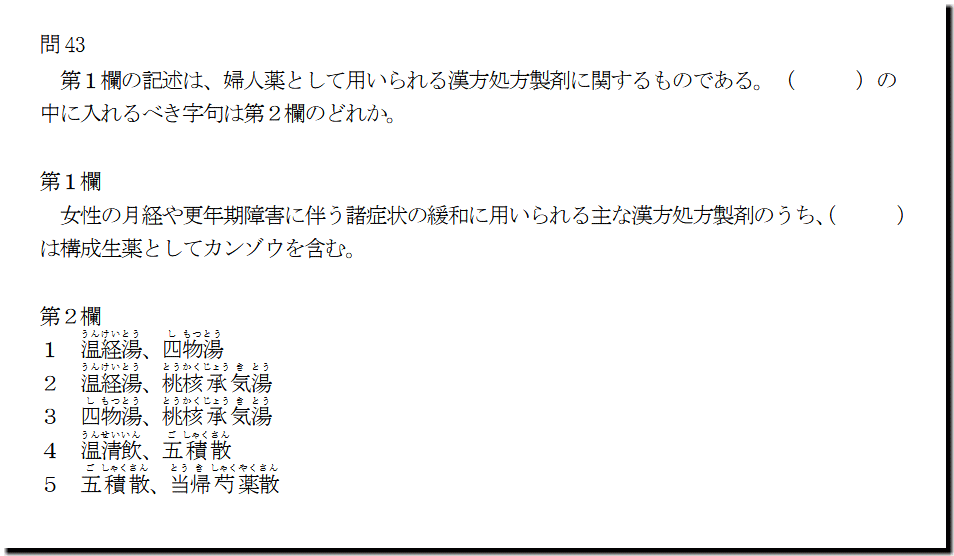 本問は、「医薬品」の「漢方処方製剤(婦人薬)」の問題です。難しいことはありません。これも勉強していないと、解けないですね。過去問に出たことは、甘く見てはいけないので、解けるようにはなっておきましょう。