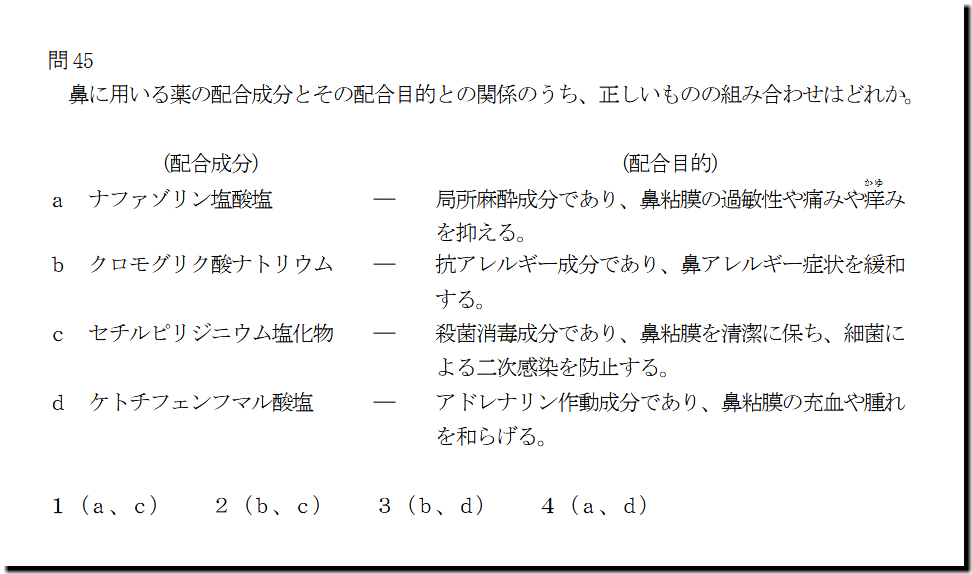 本問は、「医薬品」の「鼻に用いる薬の配合成分」についての問題です。難しいところはありません。基礎や基本ばかりの出題です。