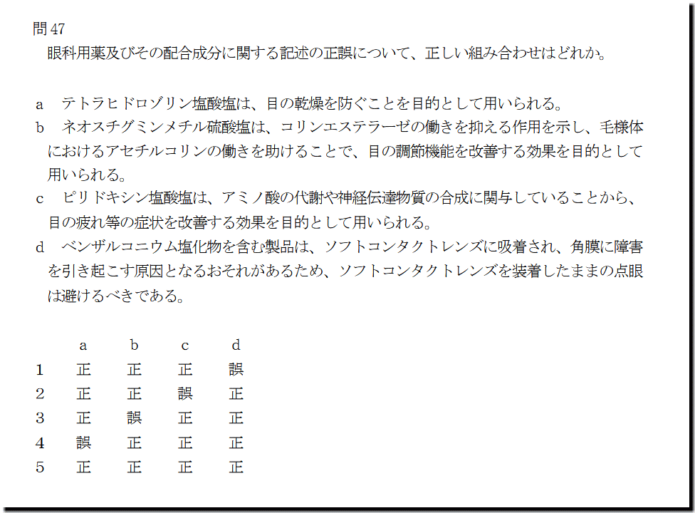 本問は、「医薬品」の「眼科用薬の配合成分2」についての問題です。選択肢の1つが簡単で、それさえできたら正解できてしまう問題です。しかし、残りの選択肢が、そこそこ手を焼きます。新手の出題もあるので、解けるようにはなっておきましょう。