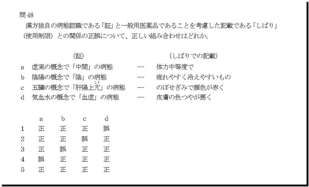 本問は、「医薬品」の「漢方独自の病態認識」についての問題です。基礎・基本的なものばかりなので、難しいところはありません。テキストと過去問を繰り返しておけば、まず、取れます。