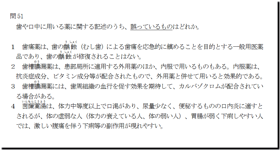 本問は、「医薬品」の「歯や口中に用いる薬」についての問題です。漢方処方製剤の選択肢が1つありますが、解けなくても、正解できます。過去問に出たことは、甘く見てはいけないので、余裕があれば、押えておきましょう。