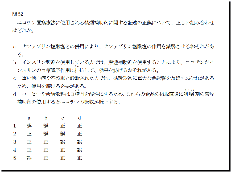 本問は、「医薬品」の「ニコチン置換療法」についての問題です。基礎・基本ばかりなので、難しくはありません。