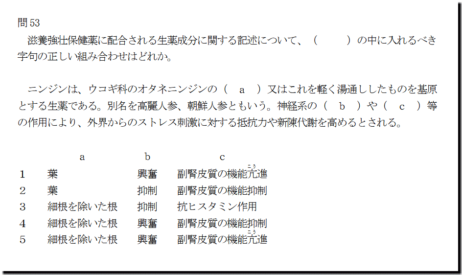 よって、答えは、「5」となります。 ニンジンは、ウコギ科のオタネニンジンの( a )又はこれを軽く湯通ししたものを基原 とする生薬である。別名を高麗人参、朝鮮人参ともいう。神経系の( b )や( c )等 の作用により、外界からのストレス刺激に対する抵抗力や新陳代謝を高めるとされる。 a b c 1 葉 興奮 副腎皮質の機能亢 こ う 進 2 葉 抑制 副腎皮質の機能抑制 3 細根を除いた根 抑制 抗ヒスタミン作用 4 細根を除いた根 興奮 副腎皮質の機能抑制 5 細根を除いた根 興奮 副腎皮質の機能亢 こ う 進 5