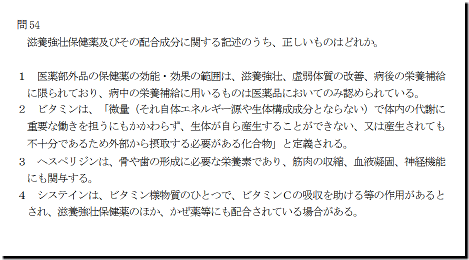 本問は、「医薬品」の「滋養強壮保健薬」についての問題です。基礎・基本的なものばかりなので、難しいところはありません。テキストと過去問を繰り返しておけば、まず、取れます。