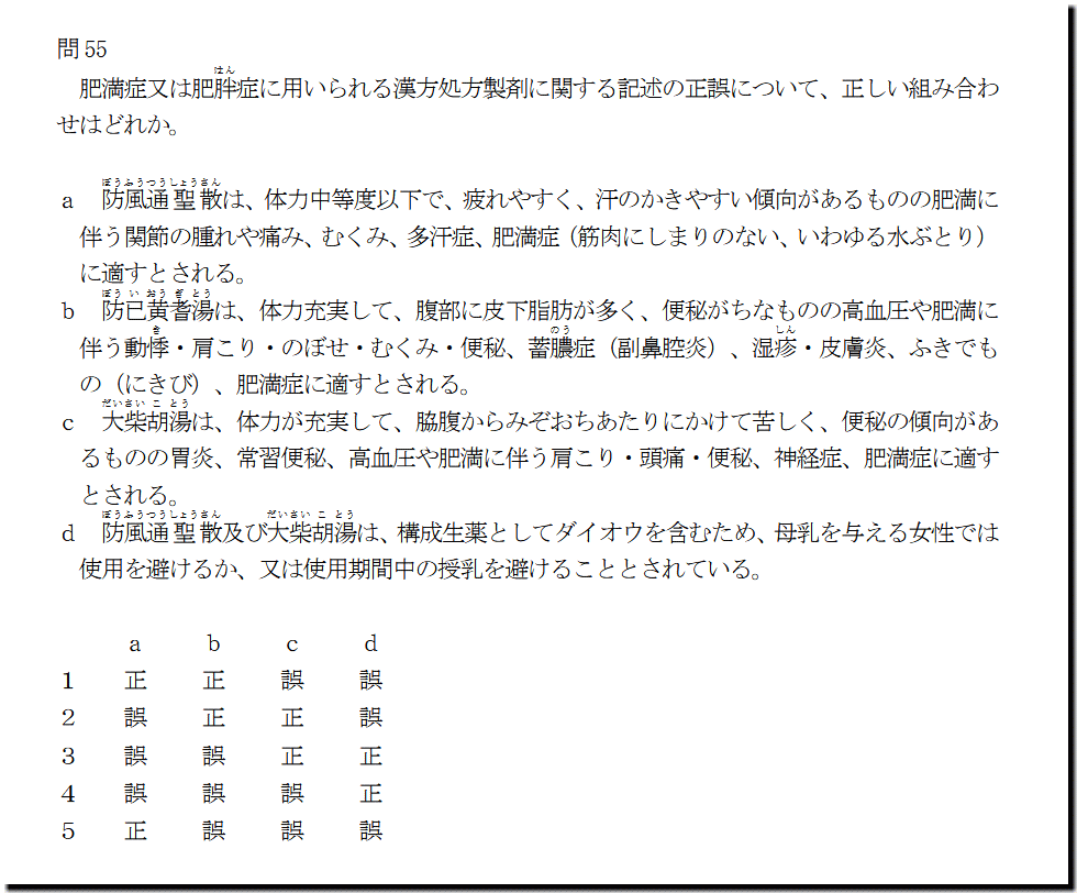 選択肢の記述は、先に見た「防風通聖散」のものですね。