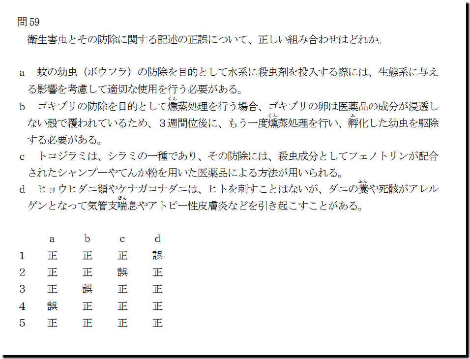 本問は、「医薬品」の「衛生害虫と防除」についての問題です。基礎・基本ばかりなので、難しくはありません。