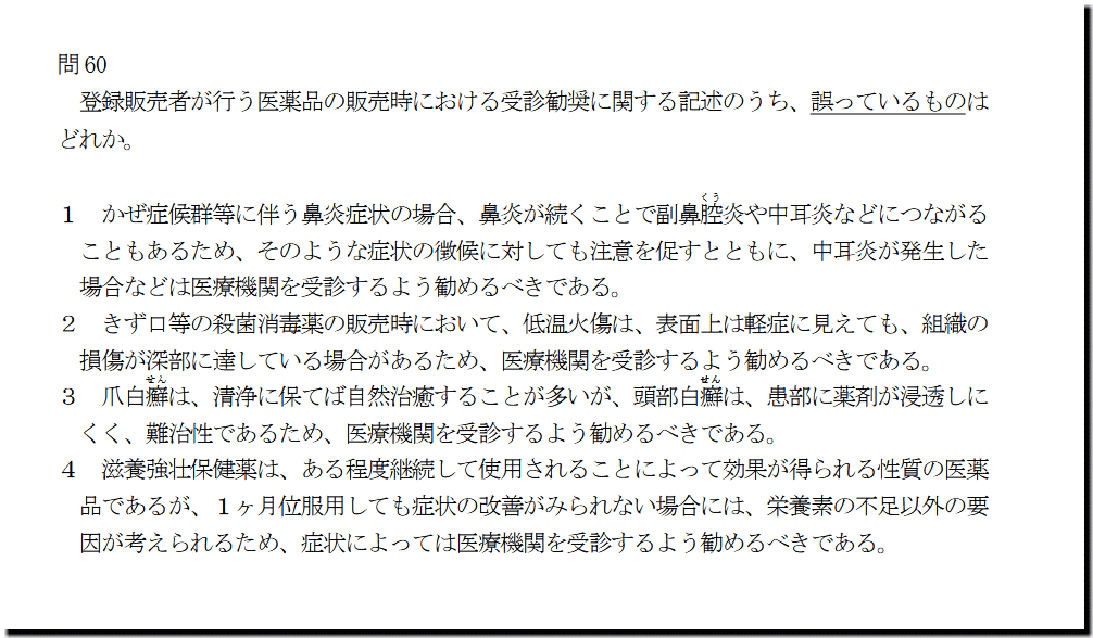 本問は、「医薬品」の「受診勧奨」についての問題です。基礎・基本的なものばかりなので、難しいところはありません。テキストと過去問を繰り返しておけば、まず、取れます。