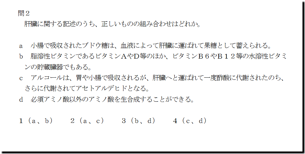 本問は、「人体」の「肝臓」についての問題です。基礎・基本的なものばかりなので、難しいところはありません。テキストと過去問を繰り返しておけば、まず、取れます。